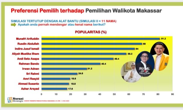 Dalam rilis Tim Nurani Strategic Consulting, Jumat, 19 Juli 2024, Munafri Arifuddin disebut masih memimpin keterpilihan pemilih Kota Makassar jelang perhelatan itu. “Di lima besar top elektabilitas, Munafri masih memimpin dengan 31,7 persen, disusul Rusdin Abdullah dengan 18,4 persen, Indira Jusuf Ismail 15,6 persen, Andi Seto Asapa 9,5 persen dan Rahman Bando dengan