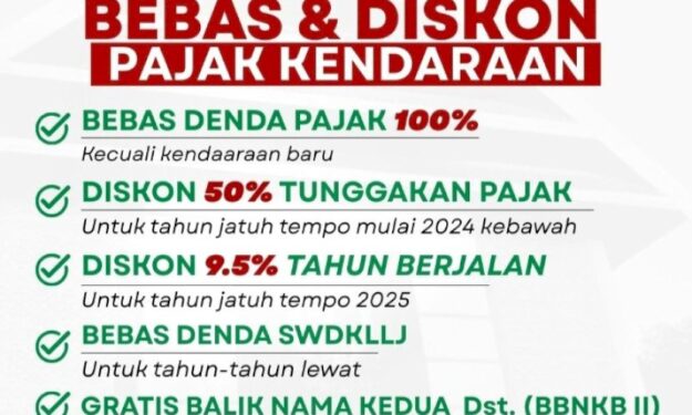 Melalui program ini, masyarakat mendapat sejumlah keringanan, antara lain pembebasan denda PKB 100 persen (kecuali kendaraan baru), pengurangan pokok pajak sebesar 50 persen untuk tunggakan tahun 2024 ke bawah, dan diskon 9,5 persen untuk pajak jatuh tempo 2025.